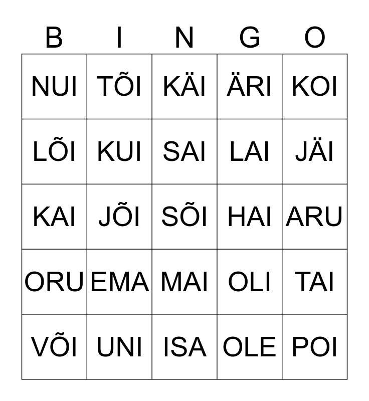 This bingo card has 25 words: EMA, ISA, SAI, VÕI, KOI, NUI, LÕI, TÕI, HAI, MAI, LAI, KAI, OLI, TAI, KUI, POI, ARU, KÄI, JÄI, JÕI, SÕI, UNI, ORU, ÄRI and OLE.