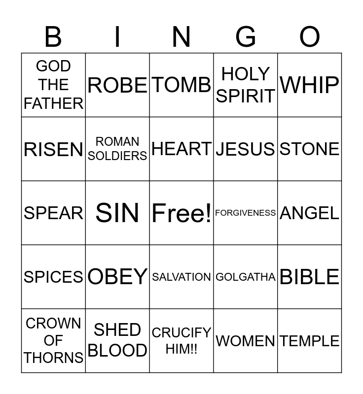 This bingo card has a free space and 24 words: OBEY, SHED BLOOD, HEART, CROWN OF THORNS, WHIP, GOD THE FATHER, RISEN, ROBE, FORGIVENESS, SALVATION, JESUS, SPEAR, GOLGATHA, BIBLE, ROMAN SOLDIERS, WOMEN, ANGEL, TOMB, STONE, SIN, TEMPLE, SPICES, HOLY SPIRIT and CRUCIFY HIM!!.