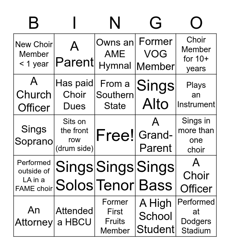 This bingo card has a free space and 24 words: Sings Solos, Attended a HBCU, From a Southern State, An Attorney, Choir Member for 10+ years, New Choir Member < 1 year, A Church Officer, A Parent, A Grand- Parent, Sings Tenor, Sings Alto, Sings Soprano, Sings Bass, A Choir Officer, Has paid Choir Dues, A High School Student, Sings in more than one choir, Owns an AME Hymnal, Plays an Instrument, Sits on the front row (drum side), Performed at Dodgers Stadium, Performed outside of LA in a FAME choir, Former VOG Member and Former First Fruits Member.