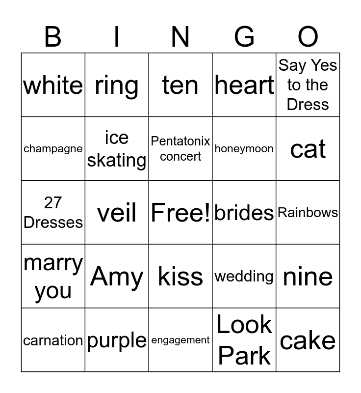 This bingo card has a free space and 24 words: Amy, purple, Pentatonix concert, carnation, Say Yes to the Dress, white, champagne, ring, brides, kiss, honeymoon, 27 Dresses, wedding, nine, ice skating, Look Park, Rainbows, ten, cat, veil, cake, marry you, heart and engagement.