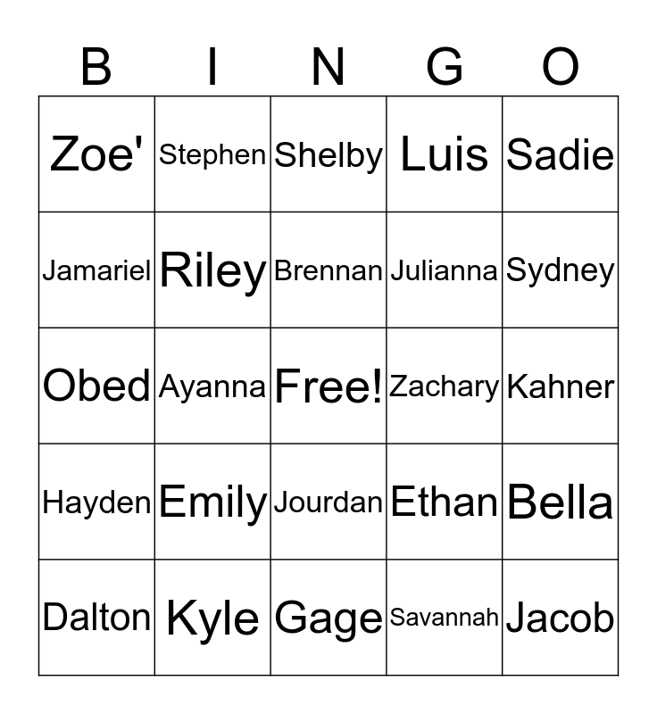 This bingo card has a free space and 24 words: Emily, Kyle, Brennan, Dalton, Sadie, Zoe', Jamariel, Stephen, Zachary, Jourdan, Julianna, Obed, Ethan, Bella, Riley, Savannah, Kahner, Shelby, Sydney, Ayanna, Jacob, Hayden, Luis and Gage.