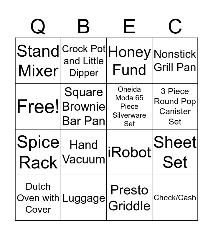 This bingo card has 16 words: Luggage, Sheet Set, Honey Fund, Stand Mixer, Spice Rack, Crock Pot and Little Dipper, iRobot, Presto Griddle, Free!, Square Brownie Bar Pan, Dutch Oven with Cover, Nonstick Grill Pan, Hand Vacuum, 3 Piece Round Pop Canister Set, Oneida Moda 65 Piece Silverware Set and Check/Cash.