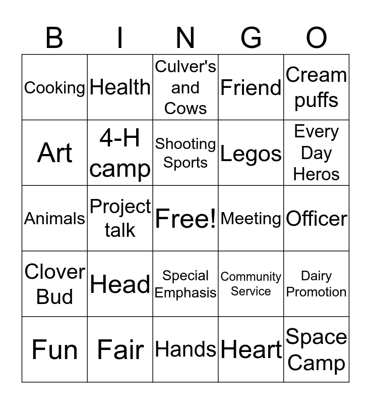 This bingo card has a free space and 24 words: Head, Fair, Shooting Sports, Fun, Cream puffs, Cooking, Art, Health, Meeting, Special Emphasis, Legos, Animals, Community Service, Dairy Promotion, 4-H camp, Heart, Officer, Culver's and Cows, Every Day Heros, Project talk, Space Camp, Clover Bud, Friend and Hands.
