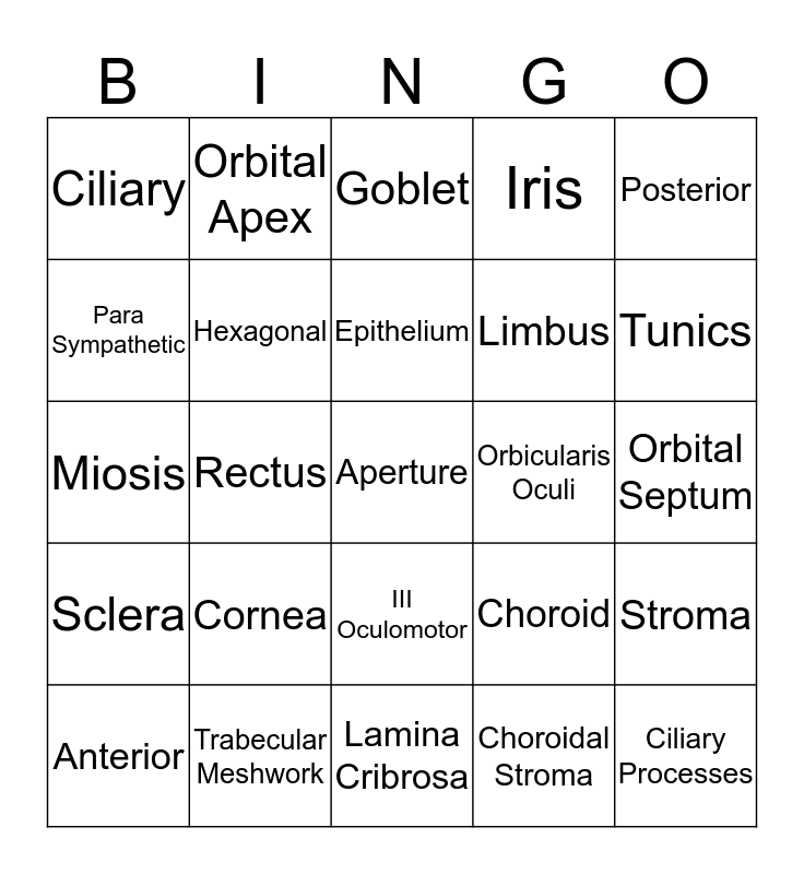 This bingo card has 25 words: Cornea, Lamina Cribrosa, Epithelium, Anterior, Posterior, Ciliary, Para Sympathetic, Orbital Apex, Orbicularis Oculi, III Oculomotor, Limbus, Miosis, Choroid, Stroma, Hexagonal, Ciliary Processes, Orbital Septum, Goblet, Tunics, Rectus, Aperture, Trabecular Meshwork, Sclera, Iris and Choroidal Stroma.