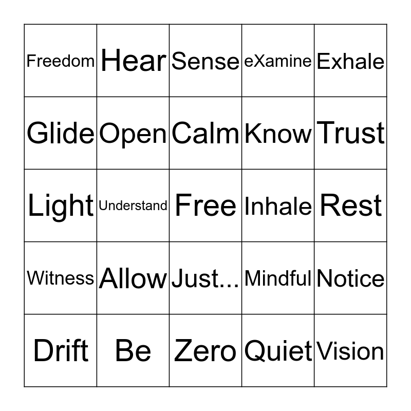 This bingo card has a free space and 24 words: Allow, Be, Calm, Drift, Exhale, Freedom, Glide, Hear, Inhale, Just..., Know, Light, Mindful, Notice, Open, Quiet, Rest, Sense, Trust, Understand, Vision, Witness, eXamine and Zero.