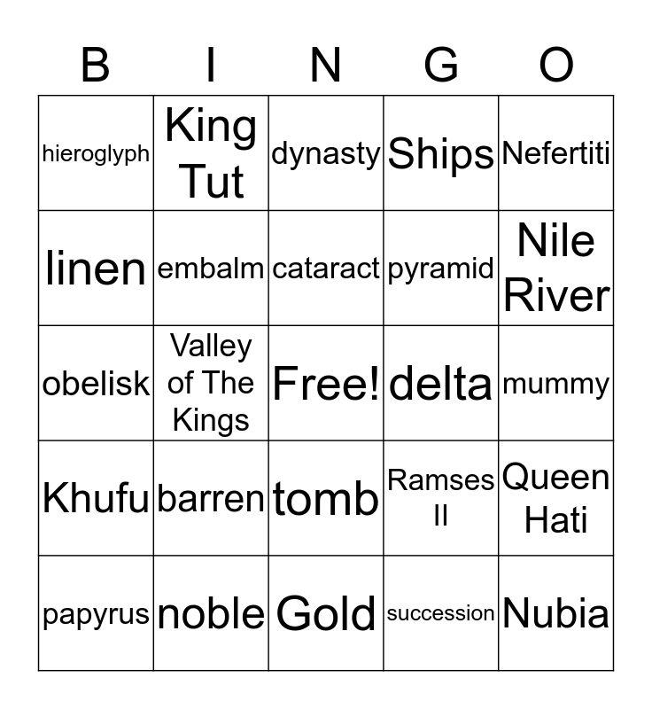 This bingo card has a free space and 24 words: barren, noble, cataract, papyrus, Nefertiti, hieroglyph, linen, King Tut, delta, tomb, pyramid, obelisk, Ramses II, Queen Hati, embalm, succession, mummy, dynasty, Nile River, Valley of The Kings, Nubia, Khufu, Ships and Gold.