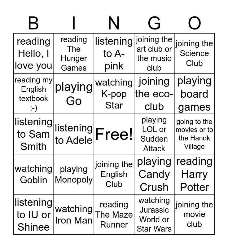 This bingo card has a free space and 29 words: listening to IU or Shinee, joining the science club, listening to Adele, playing badminton, reading Hello, I love you, listening to A-pink, playing Go, playing Monopoly, playing LOL or Sudden Attack, watching Iron Man, going to the movies or to the Hanok Village, joining the movie club, reading The Maze Runner, watching Jurassic World or Star Wars, playing board games, watching Oldboy, joining the English Club, watching Goblin, joining the Science Club, listening to Sam Smith, playing Candy Crush, listening to Ailee or EXO, joining the eco-club, reading my English textbook ;-), joining the art club or the music club, reading The Hunger Games, reading Harry Potter, watching K-pop Star and playing soccer or baseball.