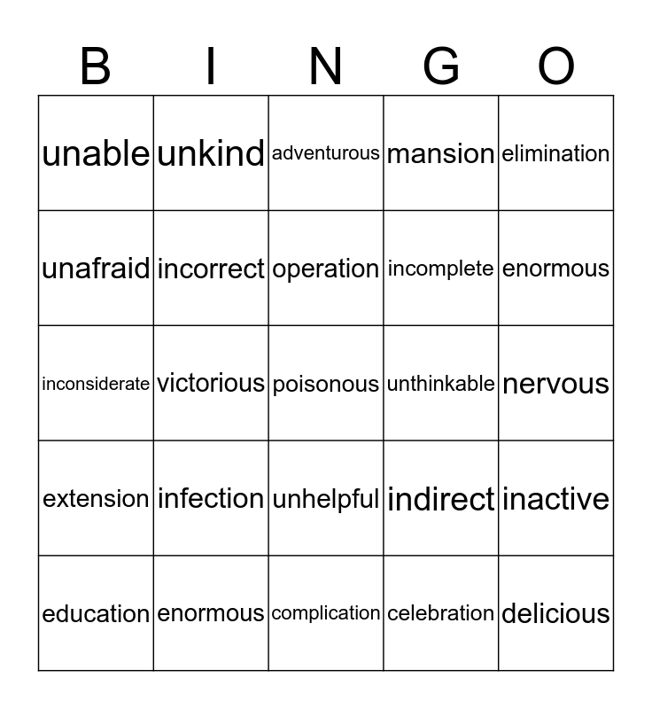 This bingo card has 25 words: infection, complication, operation, education, elimination, unable, unafraid, unkind, unthinkable, unhelpful, incomplete, inconsiderate, indirect, inactive, incorrect, delicious, nervous, adventurous, enormous, victorious, poisonous, enormous, extension, mansion and celebration.