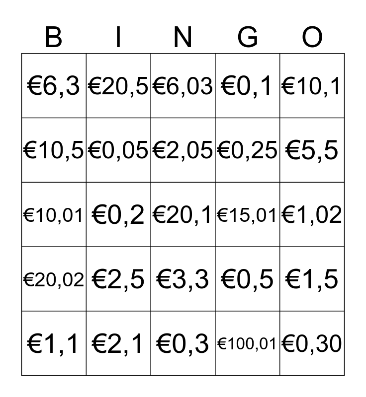 This bingo card has a free space and 24 words: €2,5, €2,1, €2,05, €1,1, €10,1, €6,3, €10,5, €20,5, €15,01, €3,3, €0,25, €10,01, €0,5, €1,5, €0,05, €100,01, €1,02, €6,03, €5,5, €0,2, €0,30, €20,02, €0,1 and €0,3.