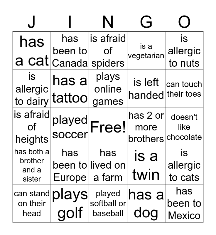 This bingo card has a free space and 24 words: has been to Europe, plays golf, plays online games, can stand on their head, is allergic to nuts, has a cat, is allergic to dairy, has been to Canada, has 2 or more brothers, has lived on a farm, is left handed, is afraid of heights, is a twin, is allergic to cats, has a tattoo, has a dog, doesn't like chocolate, is afraid of spiders, can touch their toes, played soccer, has been to Mexico, has both a brother and a sister, is a vegetarian and played softball or baseball.