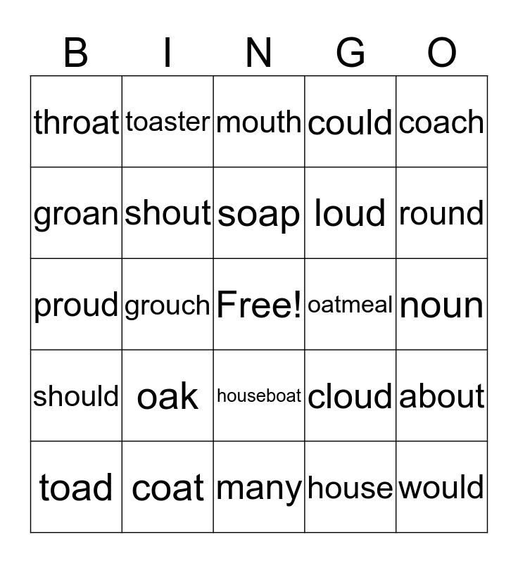 This bingo card has a free space and 24 words: oak, coat, soap, toad, coach, throat, groan, toaster, oatmeal, houseboat, loud, proud, cloud, about, shout, house, noun, mouth, round, grouch, would, should, could and many.