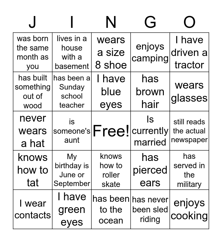 This bingo card has a free space and 24 words: My birthday is June or September, I have green eyes, I have blue eyes, I wear contacts, I have driven a tractor, was born the same month as you, has built something out of wood, lives in a house with a basement, Is currently married, knows how to roller skate, has brown hair, never wears a hat, has pierced ears, has served in the military, has been a Sunday school teacher, has never been sled riding, still reads the actual newspaper, wears a size 8 shoe, wears glasses, is someone's aunt, enjoys cooking, knows how to tat, enjoys camping and has been to the ocean.