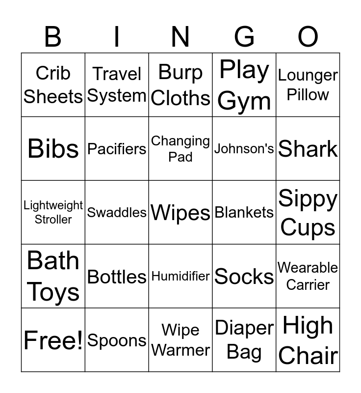 This bingo card has 29 words: Free!, Diapers, Swaddles, High Chair, Crib Sheets, Burp Cloths, Pacifiers, Bottles, Blankets, Spoons, Sippy Cups, Wipes, Wipe Warmer, Diaper Bag, Shark, Towels, Humidifier, Bath Toys, Lounger Pillow, Lightweight Stroller, Socks, Octopus, Johnson's, Bibs, Play Gym, Travel System, Wearable Carrier, Changing Pad and Convertible Car Seat.