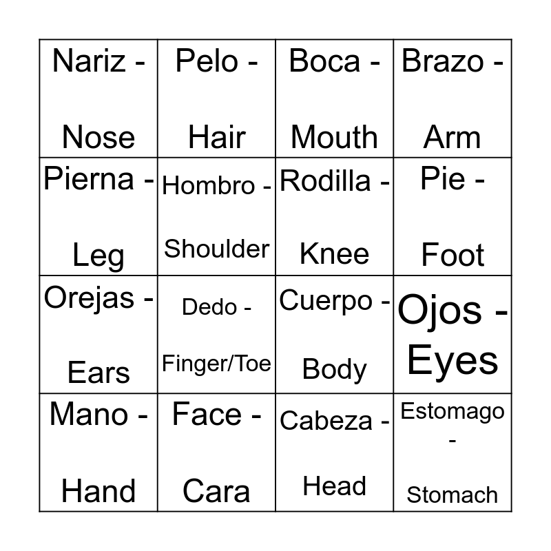 This bingo card has 16 words: Face - Cara, Ojos - Eyes, Boca - Mouth, Nariz - Nose, Orejas - Ears, Pelo - Hair, Cuerpo - Body, Cabeza - Head, Pierna - Leg, Hombro - Shoulder, Mano - Hand, Brazo - Arm, Dedo - Finger/Toe, Pie - Foot, Rodilla - Knee and Estomago - Stomach.