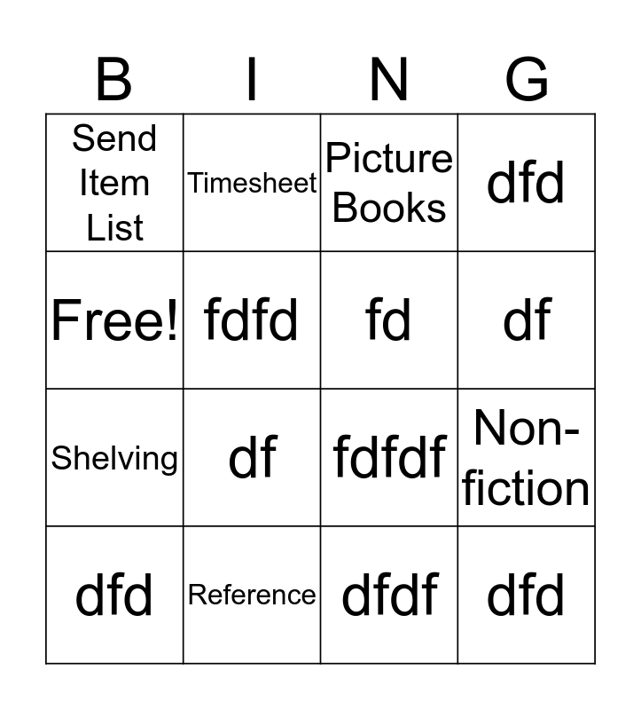 This bingo card has 16 words: Reference, Non-fiction, Picture Books, Send Item List, Shelving, Timesheet, fdfdf, dfdf, Free!, fdfd, dfd, dfd, df, df, fd and dfd.