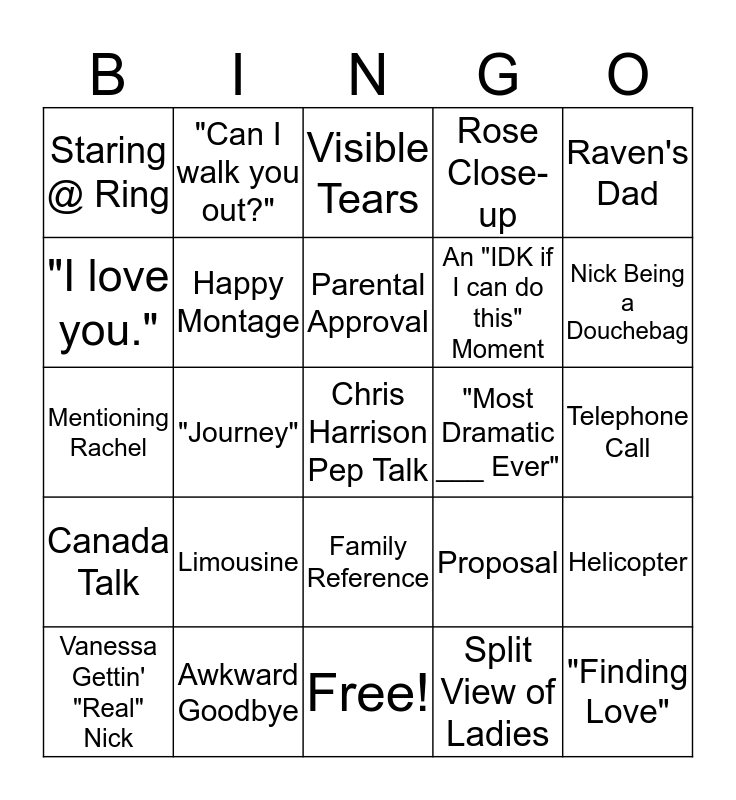 This bingo card has 31 words: Free!, "Amazing", "Journey", "Connection", Staring @ Ring, Visible Tears, Happy Montage, Proposal, "Most Dramatic ___ Ever", Split View of Ladies, Telephone Call, Chris Harrison Pep Talk, "Finding Love", Shirtless Nick, Nick Being a Douchebag, Getting Ready Montage, Helicopter, Limousine, Canada Talk, Family Reference, Raven's Dad, Raven Playing With Her Hair, Vanessa Gettin' "Real" Nick, "Can I walk you out?", An "IDK if I can do this" Moment, "I love you.", Rose Close-up, Mentioning Rachel, Awkward Goodbye, Parental Approval and Happy Tears.