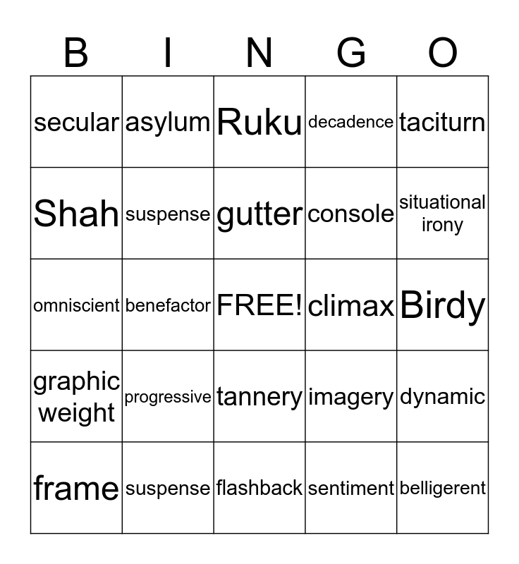 This bingo card has a free space and 24 words: progressive, suspense, gutter, frame, taciturn, secular, Shah, asylum, climax, tannery, console, omniscient, imagery, dynamic, suspense, sentiment, Birdy, Ruku, situational irony, benefactor, belligerent, graphic weight, decadence and flashback.
