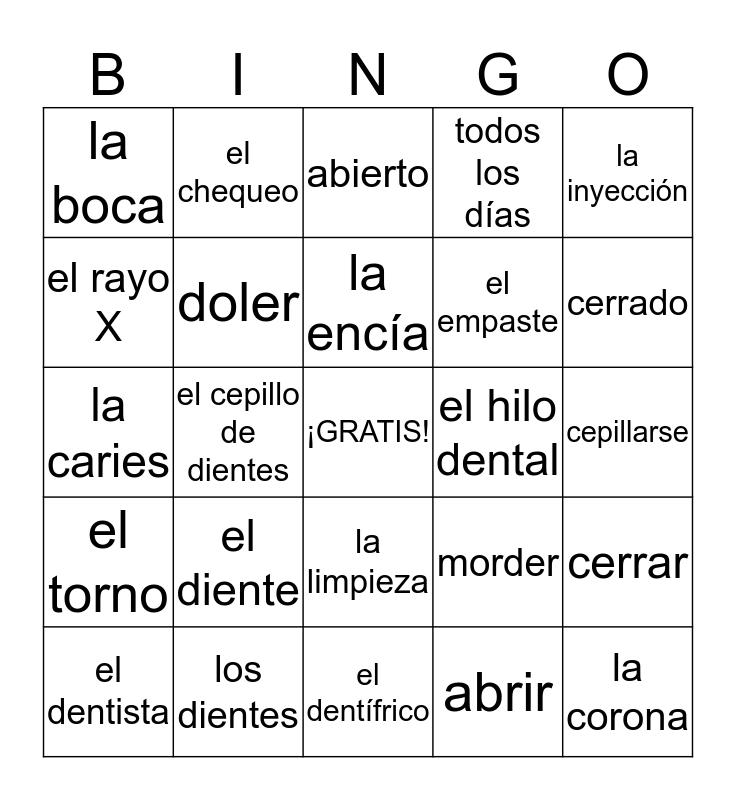 This bingo card has a free space and 24 words: el diente, los dientes, la encía, el dentista, la inyección, la boca, el rayo X, el chequeo, el hilo dental, la limpieza, el empaste, la caries, morder, cerrar, doler, abrir, cepillarse, abierto, cerrado, el cepillo de dientes, la corona, el torno, todos los días and el dentífrico.