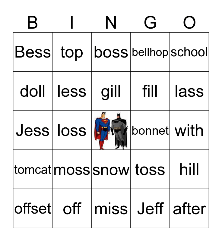 This bingo card has a free space and 24 words: moss, off, gill, offset, school, Bess, doll, top, bonnet, snow, fill, Jess, toss, hill, less, Jeff, with, boss, lass, loss, after, tomcat, bellhop and miss.
