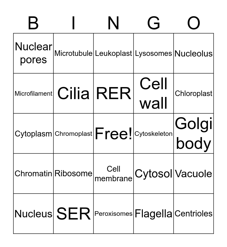 This bingo card has a free space and 24 words: Ribosome, SER, RER, Nucleus, Nucleolus, Nuclear pores, Microfilament, Microtubule, Cytoskeleton, Cell membrane, Cell wall, Cytoplasm, Cytosol, Vacuole, Cilia, Flagella, Golgi body, Leukoplast, Chloroplast, Chromoplast, Centrioles, Chromatin, Lysosomes and Peroxisomes.