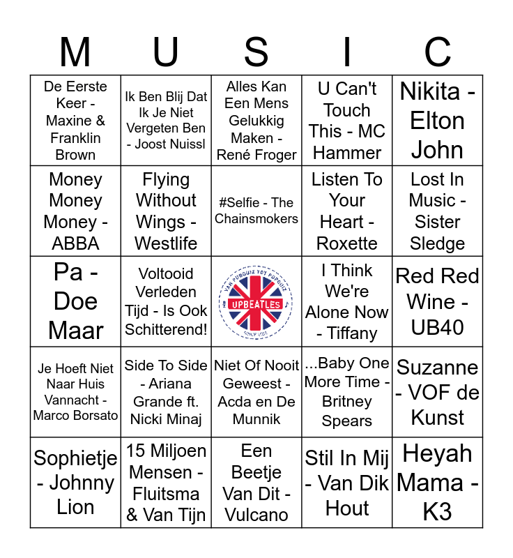 This bingo card has a free space and 24 words: Side To Side - Ariana Grande ft. Nicki Minaj, 15 Miljoen Mensen - Fluitsma & Van Tijn, #Selfie - The Chainsmokers, Sophietje - Johnny Lion, Nikita - Elton John, De Eerste Keer - Maxine & Franklin Brown, Money Money Money - ABBA, Ik Ben Blij Dat Ik Je Niet Vergeten Ben - Joost Nuissl, I Think We're Alone Now - Tiffany, Niet Of Nooit Geweest - Acda en De Munnik, Listen To Your Heart - Roxette, Pa - Doe Maar, ...Baby One More Time - Britney Spears, Suzanne - VOF de Kunst, Flying Without Wings - Westlife, Stil In Mij - Van Dik Hout, Red Red Wine - UB40, Alles Kan Een Mens Gelukkig Maken - René Froger, Lost In Music - Sister Sledge, Voltooid Verleden Tijd - Is Ook Schitterend!, Heyah Mama - K3, Je Hoeft Niet Naar Huis Vannacht - Marco Borsato, U Can't Touch This - MC Hammer and Een Beetje Van Dit - Vulcano.