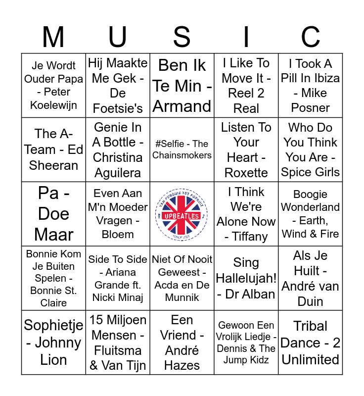 This bingo card has a free space and 24 words: Side To Side - Ariana Grande ft. Nicki Minaj, 15 Miljoen Mensen - Fluitsma & Van Tijn, #Selfie - The Chainsmokers, Sophietje - Johnny Lion, I Took A Pill In Ibiza - Mike Posner, Je Wordt Ouder Papa - Peter Koelewijn, The A-Team - Ed Sheeran, Hij Maakte Me Gek - De Foetsie's, I Think We're Alone Now - Tiffany, Niet Of Nooit Geweest - Acda en De Munnik, Listen To Your Heart - Roxette, Pa - Doe Maar, Sing Hallelujah! - Dr Alban, Als Je Huilt - André van Duin, Genie In A Bottle - Christina Aguilera, Gewoon Een Vrolijk Liedje - Dennis & The Jump Kidz, Boogie Wonderland - Earth, Wind & Fire, Ben Ik Te Min - Armand, Who Do You Think You Are - Spice Girls, Even Aan M'n Moeder Vragen - Bloem, Tribal Dance - 2 Unlimited, Bonnie Kom Je Buiten Spelen - Bonnie St. Claire, I Like To Move It - Reel 2 Real and Een Vriend - André Hazes.