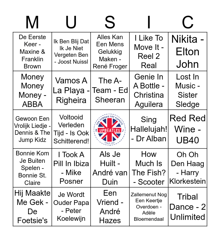 This bingo card has a free space and 24 words: I Took A Pill In Ibiza - Mike Posner, Je Wordt Ouder Papa - Peter Koelewijn, The A-Team - Ed Sheeran, Hij Maakte Me Gek - De Foetsie's, Nikita - Elton John, De Eerste Keer - Maxine & Franklin Brown, Money Money Money - ABBA, Ik Ben Blij Dat Ik Je Niet Vergeten Ben - Joost Nuissl, Sing Hallelujah! - Dr Alban, Als Je Huilt - André van Duin, Genie In A Bottle - Christina Aguilera, Gewoon Een Vrolijk Liedje - Dennis & The Jump Kidz, How Much Is The Fish? - Scooter, Oh Oh Den Haag - Harry Klorkestein, Vamos A La Playa - Righeira, Zallemenut Nog Een Keertje Overdoen - Adèle Bloemendaal, Red Red Wine - UB40, Alles Kan Een Mens Gelukkig Maken - René Froger, Lost In Music - Sister Sledge, Voltooid Verleden Tijd - Is Ook Schitterend!, Tribal Dance - 2 Unlimited, Bonnie Kom Je Buiten Spelen - Bonnie St. Claire, I Like To Move It - Reel 2 Real and Een Vriend - André Hazes.
