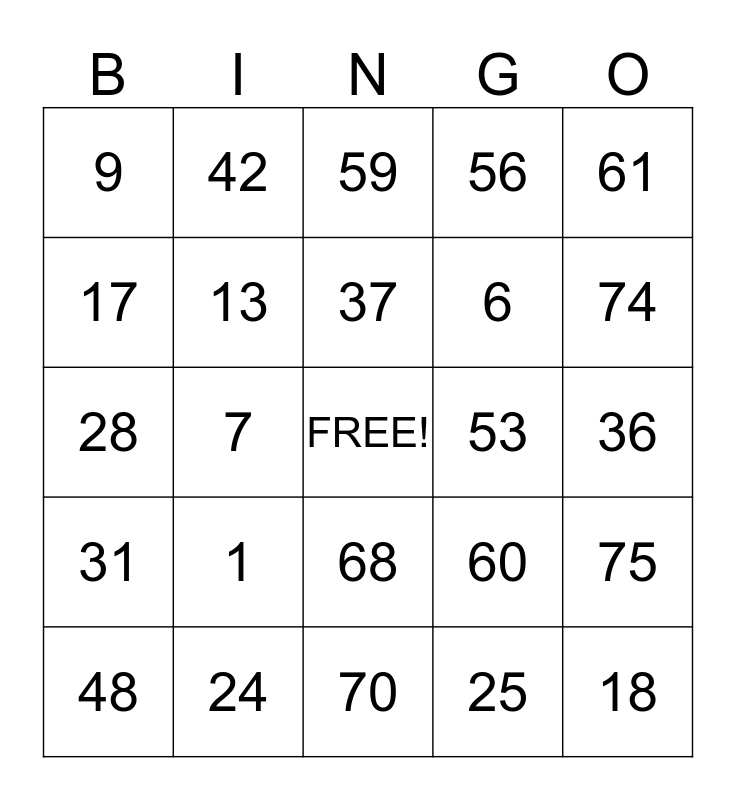 This bingo card has a free space and 24 words: 1, 24, 37, 48, 61, 9, 17, 42, 53, 68, 6, 28, 60, 75, 13, 25, 36, 59, 74, 7, 18, 31, 56 and 70.