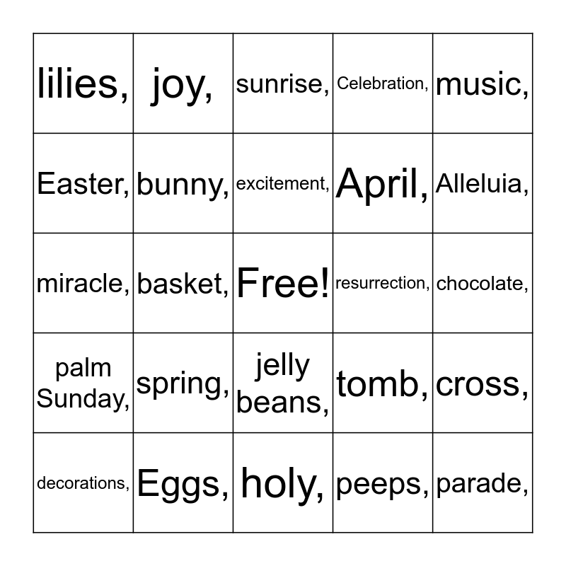 This bingo card has a free space and 30 words: Eggs,, candy,, basket,, church,, lilies,, sunrise,, bunny,, jelly beans,, resurrection,, holy,, chocolate,, parade,, peeps,, brunch,, Alleluia,, bonnet,, tomb,, palm Sunday,, spring,, music,, miracle,, lamb,, joy,, April,, Easter,, Celebration,, cross,, decorations,, excitement, and passion.