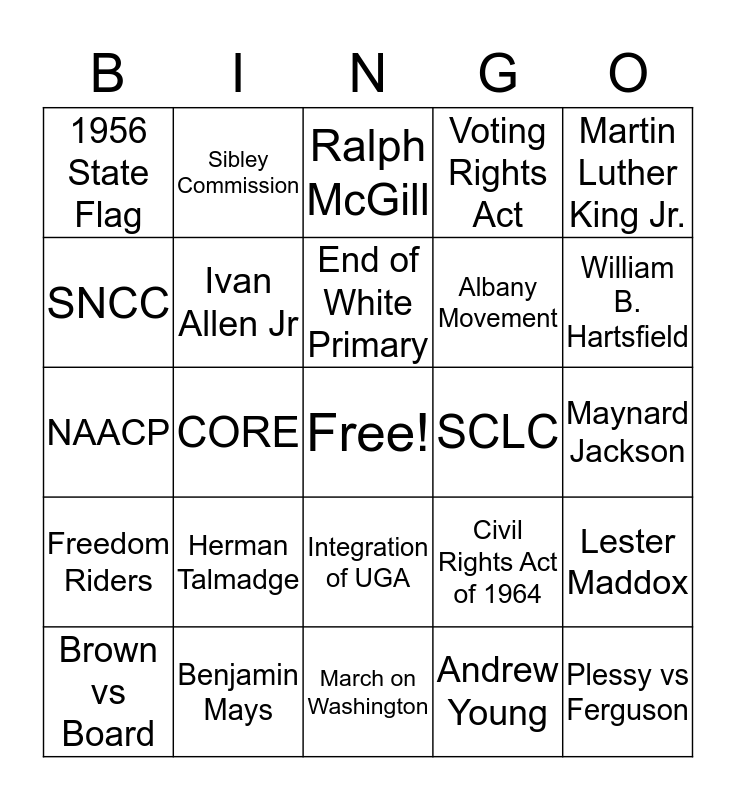 This bingo card has a free space and 24 words: Herman Talmadge, Benjamin Mays, End of White Primary, Brown vs Board, Martin Luther King Jr., 1956 State Flag, SNCC, Sibley Commission, SCLC, Integration of UGA, Albany Movement, NAACP, Civil Rights Act of 1964, Lester Maddox, Ivan Allen Jr, Andrew Young, Maynard Jackson, Ralph McGill, William B. Hartsfield, CORE, Plessy vs Ferguson, Freedom Riders, Voting Rights Act and March on Washington.