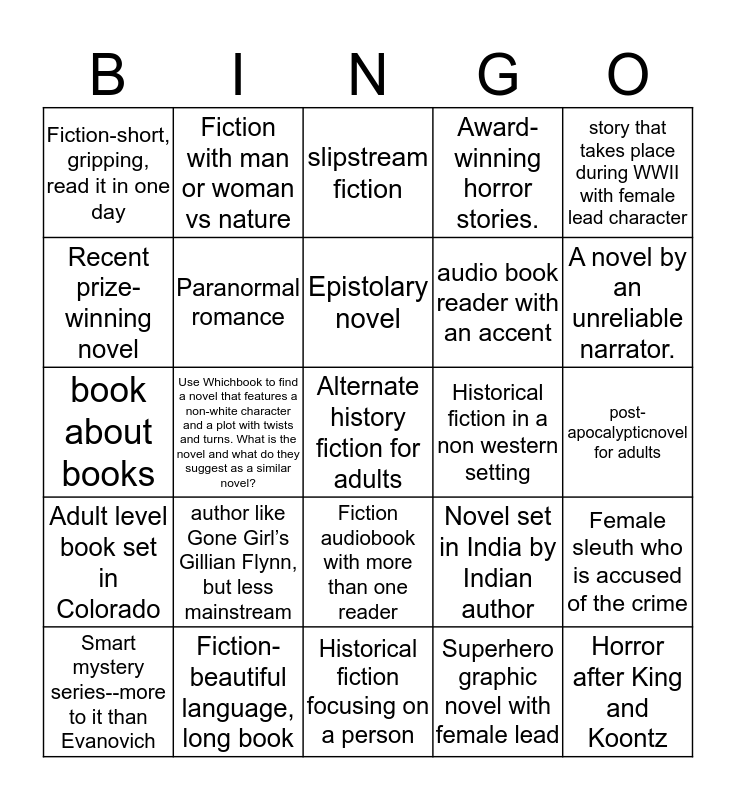This bingo card has 34 words: Horror after King and Koontz, Superhero graphic novel with female lead, Three Southern novels by different authors., Adult fiction fantasy no dragons, Adult level book set in Colorado, Paranormal romance, story that takes place during WWII with female lead character, Smart mystery series--more to it than Evanovich, Fiction with man or woman vs nature, Three sources for a list of books in a series by the same author., Epistolary novel, slipstream fiction, Collected stories of the romance variety, Page turner adventure--no grisly murders, Historical fiction in a non western setting, A novel by an unreliable narrator., Fiction-beautiful language, long book, book about books, author like Gone Girl’s Gillian Flynn, but less mainstream, Novel set in India by Indian author, Fiction audiobook with more than one reader, What are 3 recommended titles for a book club?, Fiction-short, gripping, read it in one day, post-apocalypticnovel for adults, Historical fiction focusing on a person, Alternate history fiction for adults, Award-winning horror stories., Audio book- movie coming out soon, audio book reader with an accent, Recent prize-winning novel, Adult Sci Fi novel for gamers, like Ready Player One, Use Whichbook to find a novel that features a non-white character and a plot with twists and turns. What is the novel and what do they suggest as a similar novel?, Female sleuth who is accused of the crime and inspirational fiction featuring the Amish.