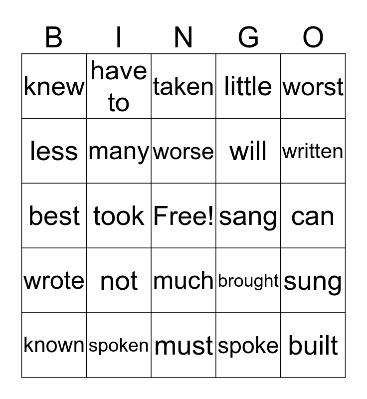 This bingo card has a free space and 35 words: good, well, bad, many, much, little, less, more, worse, better, best, worst, most, least, knew, sang, spoke, took, wrote, built, brought, known, sung, spoken, taken, written, built, brought, will, can, may, must, not, have to and don't.