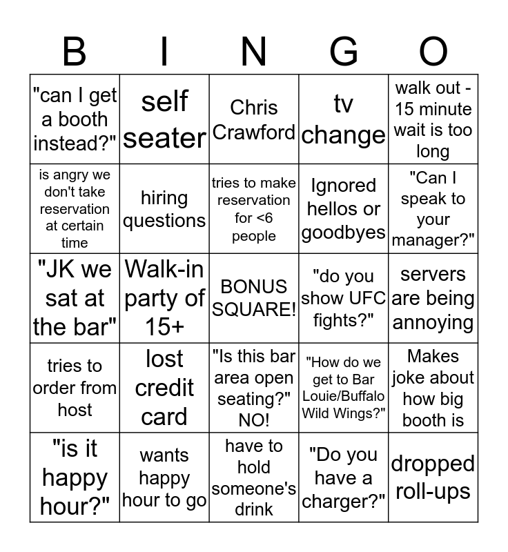 This bingo card has a free space and 24 words: lost credit card, wants happy hour to go, tries to make reservation for <6 people, "is it happy hour?", walk out - 15 minute wait is too long, "can I get a booth instead?", is angry we don't take reservation at certain time, self seater, "do you show UFC fights?", "Is this bar area open seating?" NO!, Ignored hellos or goodbyes, "JK we sat at the bar", "How do we get to Bar Louie/Buffalo Wild Wings?", Makes joke about how big booth is, hiring questions, "Do you have a charger?", servers are being annoying, Chris Crawford, "Can I speak to your manager?", Walk-in party of 15+, dropped roll-ups, tries to order from host, tv change and have to hold someone's drink.