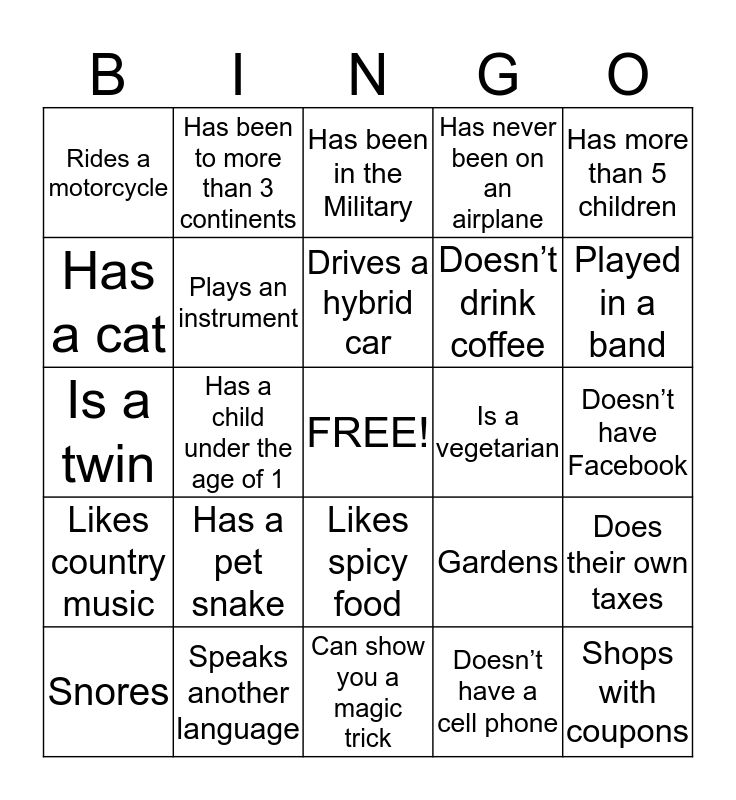 This bingo card has a free space and 30 words: Speaks another language, Recently went to a concert, Has a child under the age of 1, Is left handed, Rides a motorcycle, Has been in the Military, Plays an instrument, Likes spicy food, Is a vegetarian, Can show you a magic trick, Doesn’t have Facebook, Shops with coupons, Doesn’t have a cell phone, Can bake a cake from scratch, Played in a band, Kills house plants, Gardens, Likes country music, Has a pet snake, Has more than 5 children, Is a twin, Has a dog, Has been to more than 3 continents, Doesn’t drink coffee, Has a cat, Has never been on an airplane, Does their own taxes, Snores, Drives a hybrid car and Doesn’t like chocolate.