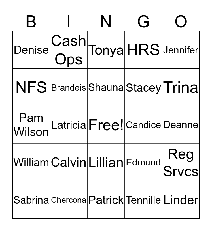 This bingo card has a free space and 29 words: Sabrina, Tanisha, Latricia, Chrystal, Denise, Tonya, Brandeis, Calvin, Candice, Chercona, Deanne, Linder, Patrick, Tennille, Trina, Belinda, Lillian, William, Jennifer, Pam Wilson, Edmund, Latrice, Stacey, NFS, HRS, Cash Ops, Reg Srvcs, Shauna and Keith.