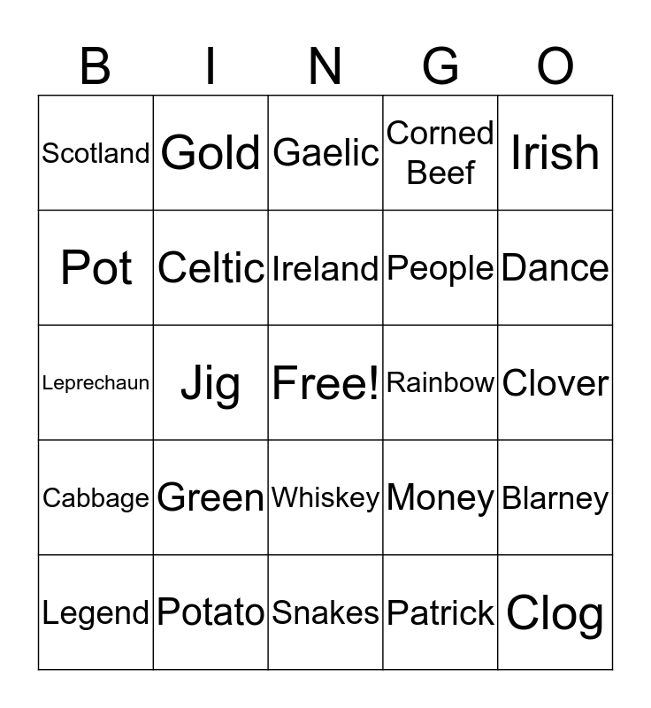 This bingo card has a free space and 24 words: Green, Potato, Ireland, Legend, Irish, Scotland, Pot, Gold, Rainbow, Whiskey, People, Leprechaun, Money, Blarney, Celtic, Patrick, Clover, Gaelic, Dance, Jig, Clog, Cabbage, Corned Beef and Snakes.