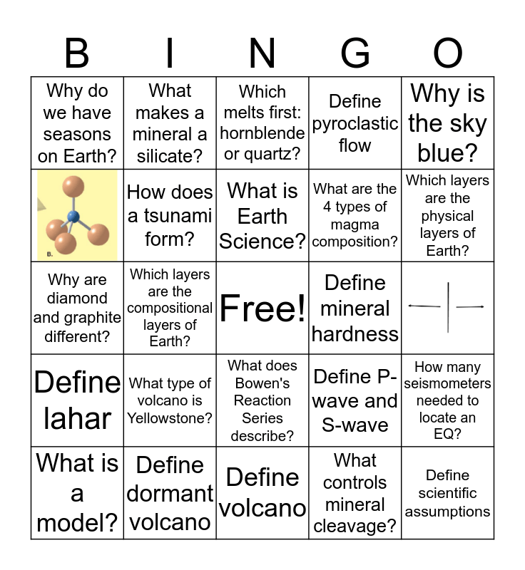 This bingo card has 2 images, a free space and 22 words: What type of volcano is Yellowstone?, Define dormant volcano, What is Earth Science?, What is a model?, Why is the sky blue?, Why do we have seasons on Earth?, What makes a mineral a silicate?, Define mineral hardness, What does Bowen's Reaction Series describe?, What are the 4 types of magma composition?, Why are diamond and graphite different?, Define P-wave and S-wave, How many seismometers needed to locate an EQ?, How does a tsunami form?, What controls mineral cleavage?, Which melts first: hornblende or quartz?, Which layers are the physical layers of Earth?, Which layers are the compositional layers of Earth?, Define scientific assumptions, Define lahar, Define pyroclastic flow and Define volcano.