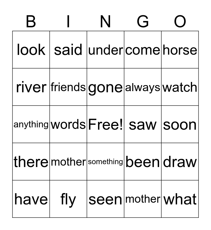 This bingo card has a free space and 24 words: mother, fly, gone, have, horse, look, river, said, saw, something, always, anything, been, draw, friends, mother, soon, under, watch, words, what, there, come and seen.
