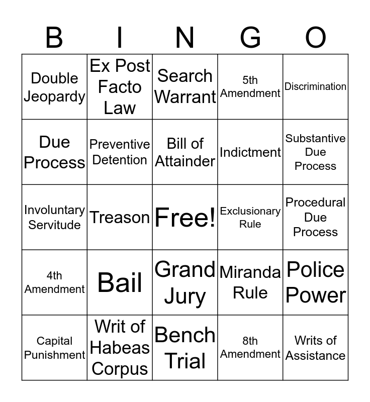 This bingo card has a free space and 25 words: Bail, Bench Trial, Bill of Attainder, Capital Punishment, Discrimination, Double Jeopardy, Due Process, Ex Post Facto Law, Exclusionary Rule, Grand Jury, Indictment, Involuntary Servitude, Miranda Rule, Police Power, Preventive Detention, Probable Cause, Procedural Due Process, Search Warrant, Substantive Due Process, Treason, Writs of Assistance, Writ of Habeas Corpus, 4th Amendment, 5th Amendment and 8th Amendment.