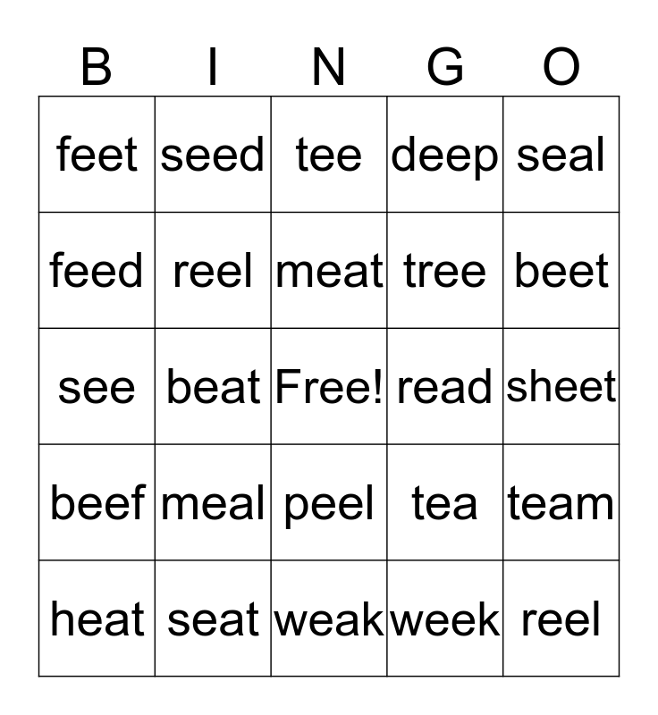 This bingo card has a free space and 24 words: meal, seat, meat, heat, seal, feet, feed, seed, read, peel, tree, see, tea, team, reel, week, sheet, tee, beet, beat, reel, beef, deep and weak.