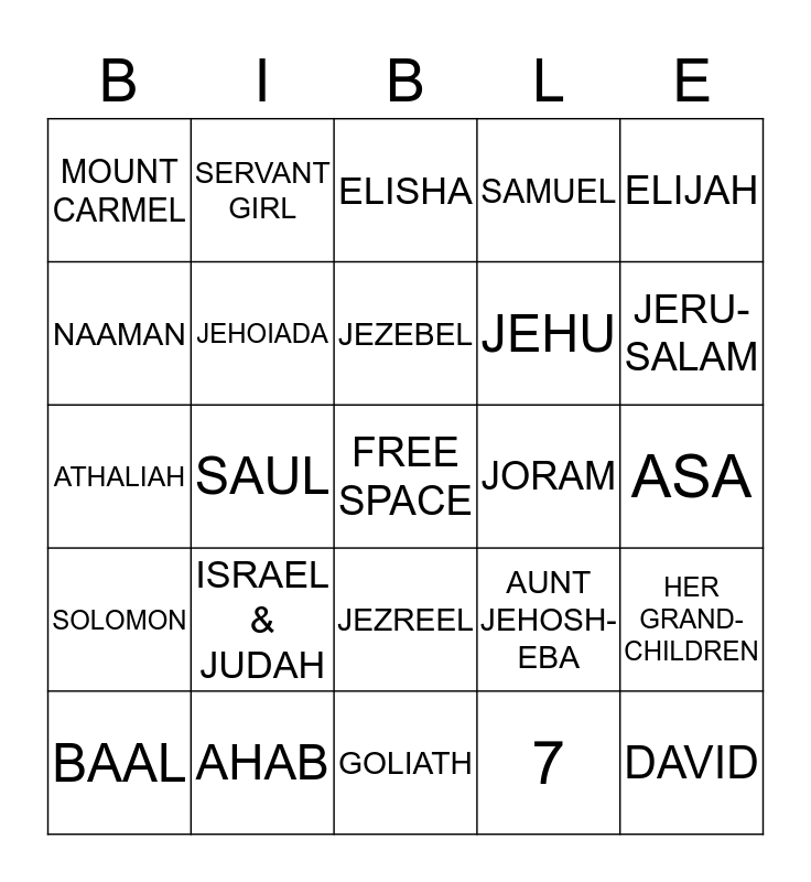 This bingo card has a free space and 24 words: ISRAEL & JUDAH, AHAB, JEZEBEL, BAAL, ELIJAH, MOUNT CARMEL, NAAMAN, SERVANT GIRL, JORAM, JEZREEL, JEHU, ATHALIAH, AUNT JEHOSH-EBA, HER GRAND-CHILDREN, JEHOIADA, 7, ASA, ELISHA, JERU-SALAM, SAUL, DAVID, SOLOMON, SAMUEL and GOLIATH.