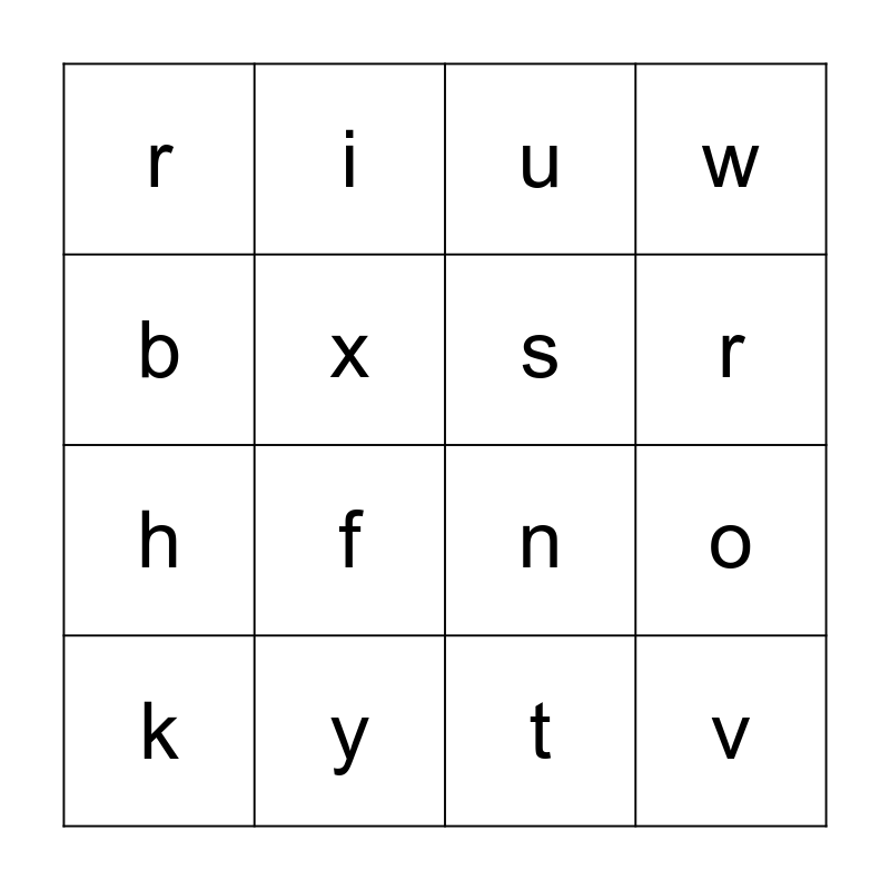 This bingo card has 16 words: y, o, u, r, h, i, n, t, b, x, k, w, f, r, s and v.