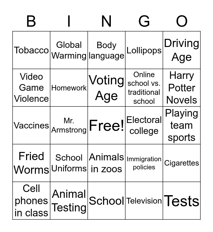 This bingo card has a free space and 24 words: School Uniforms, Animal Testing, Voting Age, Cell phones in class, Driving Age, Tobacco, Video Game Violence, Global Warming, Electoral college, Animals in zoos, Online school vs. traditional school, Vaccines, Immigration policies, Cigarettes, Homework, Television, Playing team sports, Body language, Harry Potter Novels, Mr. Armstrong, Tests, Fried Worms, Lollipops and School.