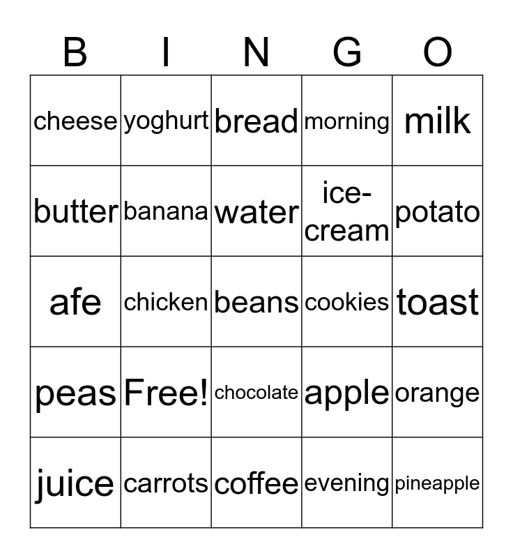 This bingo card has 25 words: Free!, coffee, water, juice, milk, cheese, butter, yoghurt, cookies, chocolate, ice-cream, afe, apple, orange, banana, pineapple, toast, bread, potato, chicken, beans, carrots, peas, morning and evening.