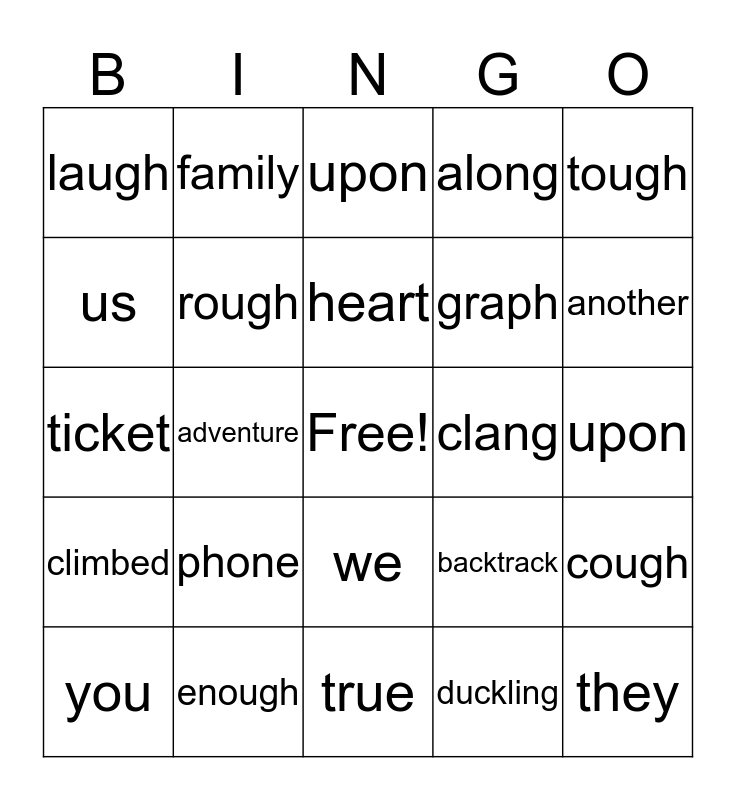 This bingo card has a free space and 24 words: phone, enough, heart, you, tough, laugh, us, family, clang, we, graph, ticket, backtrack, cough, rough, duckling, upon, upon, another, adventure, they, climbed, along and true.