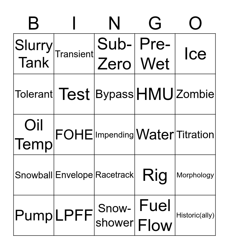 This bingo card has 25 words: Envelope, Snow-shower, Bypass, Pump, Ice, Slurry Tank, Tolerant, Transient, Water, Racetrack, HMU, Oil Temp, Rig, Morphology, Test, Historic(ally), Titration, Sub-Zero, Zombie, FOHE, Impending, LPFF, Snowball, Pre-Wet and Fuel Flow.