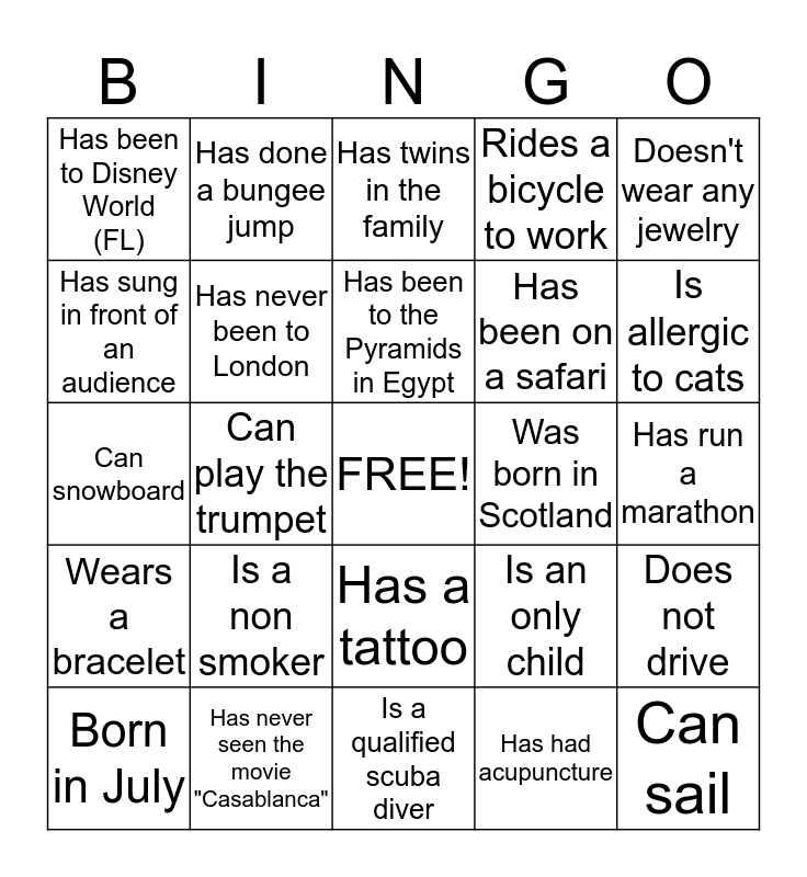 This bingo card has a free space and 24 words: Is a non smoker, Has never seen the movie "Casablanca", Has been to the Pyramids in Egypt, Born in July, Doesn't wear any jewelry, Has been to Disney World (FL), Has sung in front of an audience, Has done a bungee jump, Was born in Scotland, Has a tattoo, Has been on a safari, Can snowboard, Is an only child, Does not drive, Has never been to London, Has had acupuncture, Has run a marathon, Has twins in the family, Is allergic to cats, Can play the trumpet, Can sail, Wears a bracelet, Rides a bicycle to work and Is a qualified scuba diver.