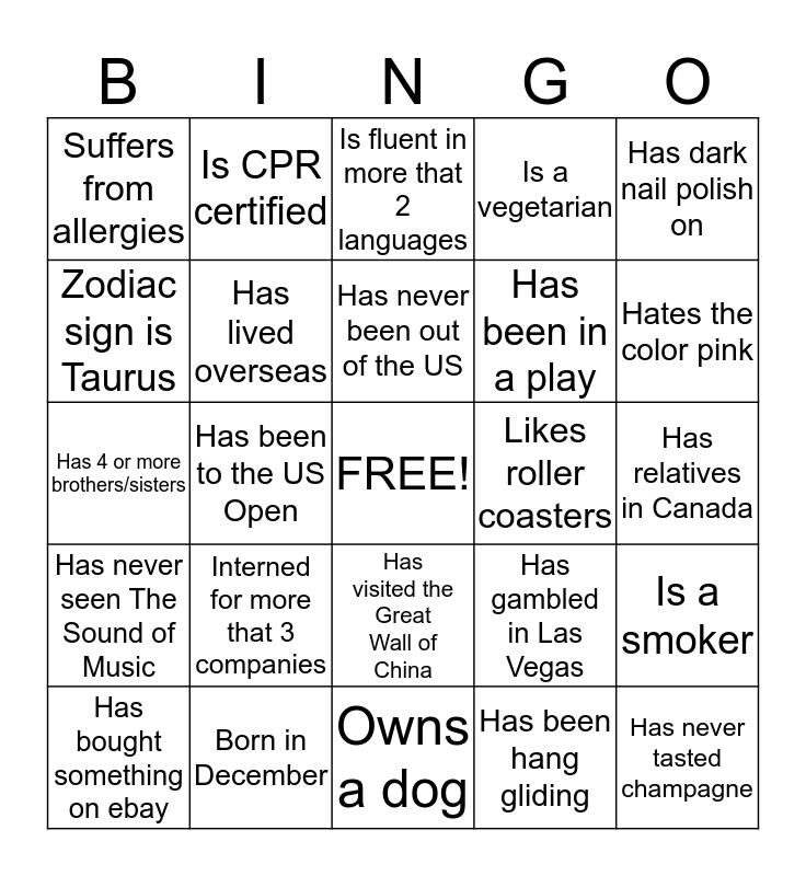 This bingo card has a free space and 24 words: Interned for more that 3 companies, Born in December, Has never been out of the US, Has bought something on ebay, Has dark nail polish on, Suffers from allergies, Zodiac sign is Taurus, Is CPR certified, Likes roller coasters, Has visited the Great Wall of China, Has been in a play, Has 4 or more brothers/sisters, Has gambled in Las Vegas, Is a smoker, Has lived overseas, Has been hang gliding, Has relatives in Canada, Is fluent in more that 2 languages, Hates the color pink, Has been to the US Open, Has never tasted champagne, Has never seen The Sound of Music, Is a vegetarian and Owns a dog.