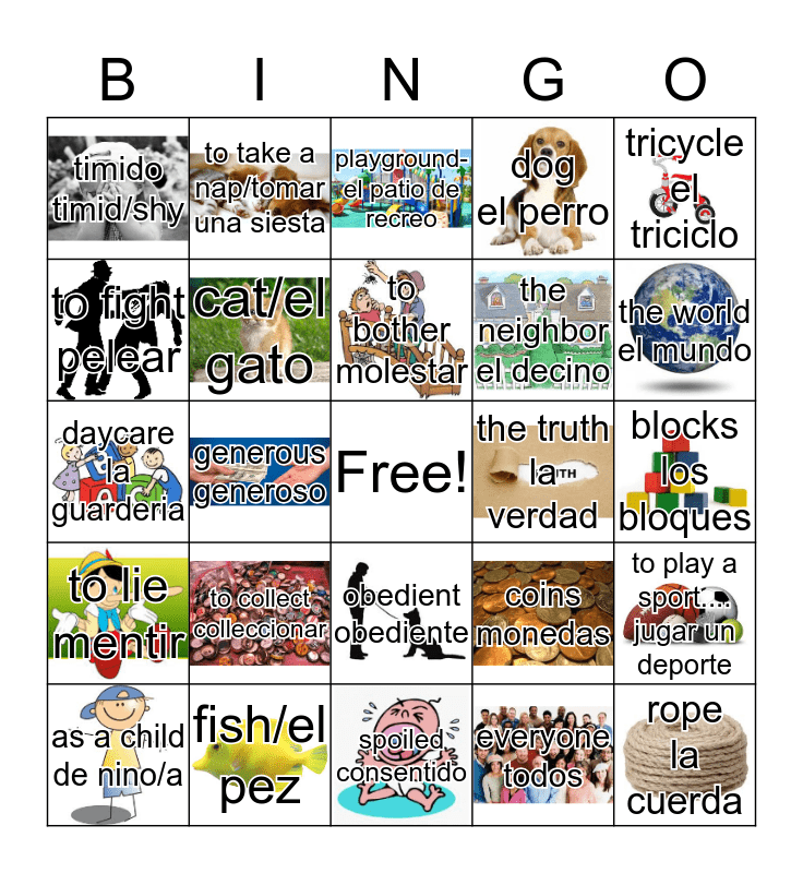 This bingo card has 24 images, a free space and 24 words: to collect colleccionar, fish/el pez, to bother molestar, as a child de nino/a, tricycle el triciclo, timido timid/shy, to fight pelear, to take a nap/tomar una siesta, the truth la verdad, obedient obediente, the neighbor el decino, daycare la guarderia, coins monedas, to play a sport.... jugar un deporte, cat/el gato, everyone todos, blocks los bloques, playground- el patio de recreo, the world el mundo, generous generoso, rope la cuerda, to lie mentir, dog el perro and spoiled consentido.