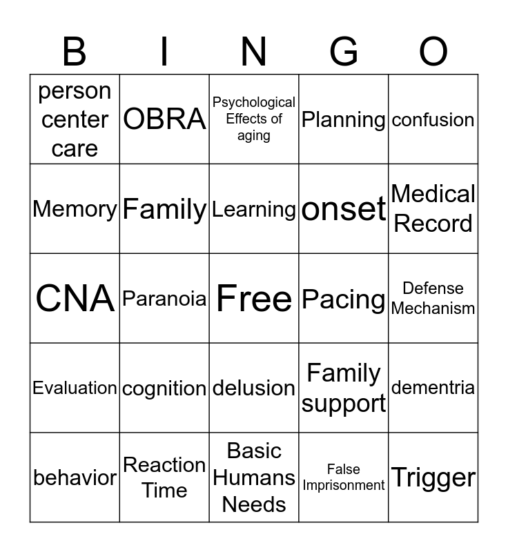 This bingo card has a free space and 24 words: cognition, Reaction Time, Learning, behavior, confusion, person center care, Memory, OBRA, Pacing, delusion, onset, CNA, Family support, dementria, Family, False Imprisonment, Defense Mechanism, Psychological Effects of aging, Medical Record, Paranoia, Trigger, Evaluation, Planning and Basic Humans Needs.